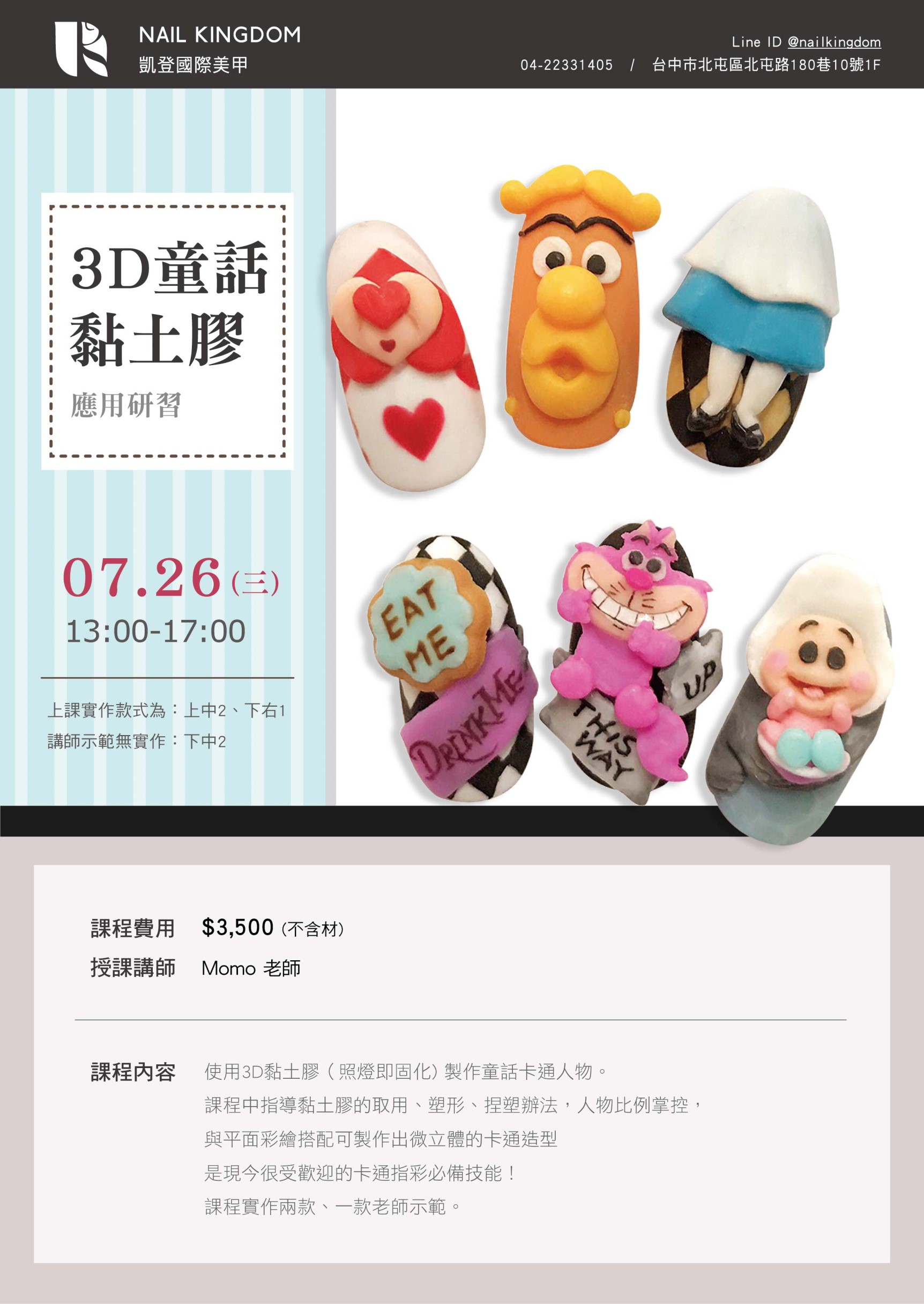 這次邀請陳彥君momo老師來台中教授凝膠粉雕課程,momo老師此次以愛麗絲為主題,將其中可愛又逗趣的角色應用在3D凝膠粉雕上,並以實際沙龍製作為考量而設計出來的款式設計,讓您擺脫一成不變的粉雕造型!!